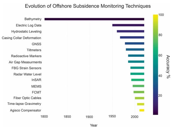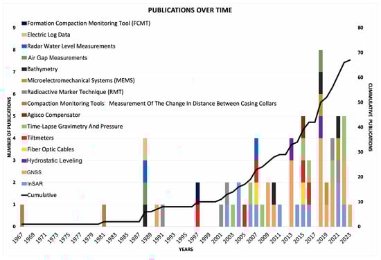 The objective of this study is to comprehensively review historical and contemporary offshore subsidence monitoring techniques through a systematic literature review. This compilation encompasses techniques with accompanying case studies Figure 2, some of which may lack published data. A comparative analysis was conducted, juxtaposing data derived from the multiple techniques employed to monitor subsidence and compaction. All the data presented in this paper originate from a review of 93 papers (Table 1) published in scholarly journals.