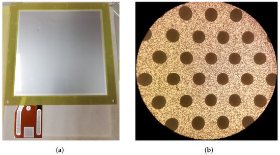 Photographs of the aluminium GEM foil. (a) View of the whole 10 cm × 10 cm foil (framed—ready to mount in the detector). (b) Magnified microphotography of the foil.