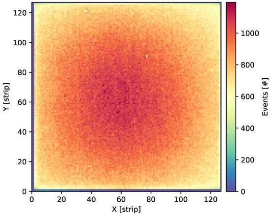 The first verification step is to build an 55Fe irradiation map as a form of the cumulative counts over the whole detector active area. The reconstruction result is plotted as shown in Figure 3.