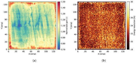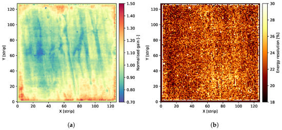 The next step is to create gas gain and energy resolution maps across the detector’s surface. To construct comprehensive maps of these parameters, an event reconstruction procedure is utilised to build individual energy spectra for all detector “pixels”. The reconstruction procedure is the same as described in our previous reports [,].