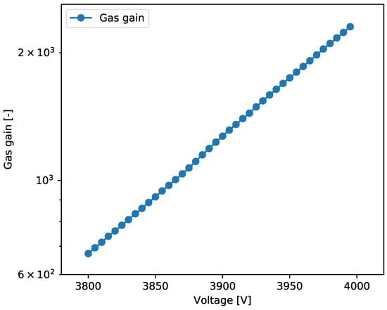 As expected, the gas gain increases exponentially with a growth in the bias voltage. There are no significant deviations from the expected behaviour, which is a good indicator of the detector’s stability. The gas gain values are consistent with the results obtained in previous studies [,]. The actual values are slightly lower than those using chromium-clad foils and are comparable to standard copper-clad foils []. This is most probably due to the smaller overall thickness of the chromium-clad foils (reduced by etching of the copper layers), which results in a higher electric field inside the holes and thus higher gas gain.