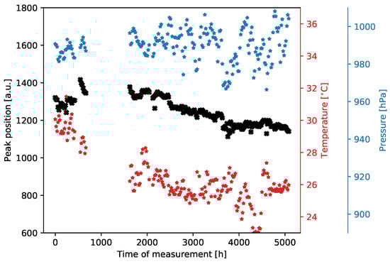 Long-term operation of the GEM detector with aluminium-clad foils. Black crosses represent the peak position, while red and blue stars represent the gas temperature and pressure, respectively. One can observe that the average gas gain (represented by the peak position) is kept almost constant, despite there being a season change and no (re-)calibration procedure applied.