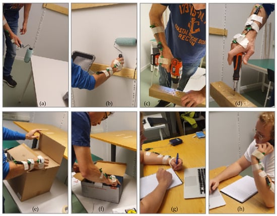Painting task, the participants painted various vertical and horizontal surfaces (a,b), drilling and screwing with a screwdriver (c,d). Warehouse simulated task: boxes were picked up from the floor and placed on a shelf (e,f); simulated office work, including typing, taking notes, and making phone calls (g,h).