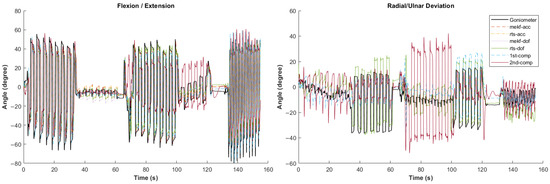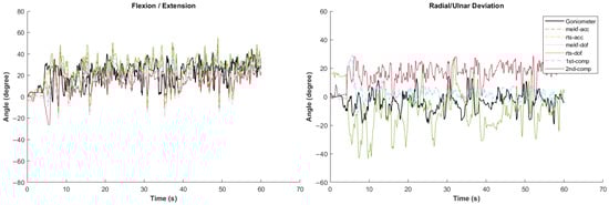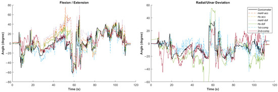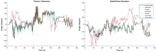 The IMU-based estimation of wrist posture, i.e., 3D orientation estimation, particularly in terms of absolute angles, presents significant challenges in biomechanics research. Efforts have been made to enhance this estimation by applying fusion algorithms, which aim to utilise the IMU signals optimally. These algorithms aim to approximate a golden standard typically derived from optical tracers or electrogoniometers. Notably, some experiments have excluded magnetometer signals, experimenting with both the presence and absence of these measurements to determine their impact on the accuracy of wrist posture estimation. Poitras’ review [18] analysed six studies involving a total of 51 participants and describes the research on wrist joint estimation as inconsistent. Considerable variability was found in the accuracy of these measurements, as indicated by the root mean square error (RMSE) and correlation coefficients. RMSE values varied significantly from 2.2 to 30°, and correlation coefficients ranged from 0.62 to 0.99, suggesting fair to good validity. The review noted poorer results for radial–ulnar deviation movements than flexion-extension movements.