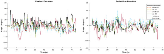 Figure 2, Figure 3, Figure 4, Figure 5 and Figure 6 showcase selected sample signal plots from each simulated task performed by one participant. The reference signals from the electrogoniometer are represented in black, while the IMU-based wrist angle estimations obtained from each orientation filter are depicted in colours. These plots offer a visual representation of wrist movements performed during the tasks.