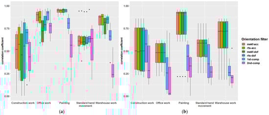 Boxplots of the correlation coefficients between the IMU-based wrist angle estimation and the electrogoniometer divided by different simulated work tasks for every orientation algorithm, (a) flexion/extension, (b) radial/ulnar deviation. Boxplots are created in R Studio version 1.4.1717. Dots represent outliers.