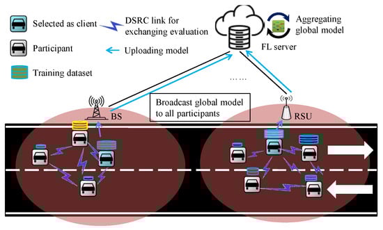 Federated learning is realized as an emerging effective maneuver for protecting user privacy and can be applied to the IoV regarding data sharing, collaborative intelligence, and distributed machine learning [,]. In the future, vehicles with intelligence will be mainstream in the ITS, in which various AI apps are deployed to assist with driving. Additionally, the vehicle has some resources such as computational capability, communication ability, and storage for processing the data collected by the sensors. These vehicles not only exchange basic information with each other but also share the knowledge learned from the AI model among the vehicles.