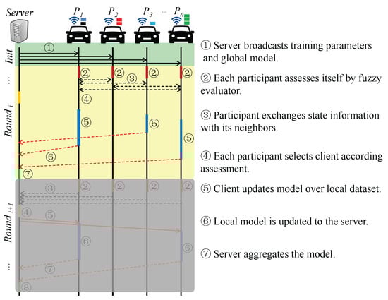 Selection stage: The server is responsible for broadcasting fuzzy parameters involving the membership functions and the fuzzy rules to all participants at the beginning of the communication round. The vehicles assess themselves according to the current state information. Then, the assessment is exchanged with the neighbors. Finally, each participant sorts and selects the clients from the top m neighbors as the clients. The fuzzy parameters are configured based on historical records stored on the server. It is assumed that the server can analyze the historical records and find the optimal fuzzy parameters to meet the system’s requirements. This stage corresponds to steps ➁–➃ in Figure 2. Notably, step ➀ is run only once at the initialization of the FL.