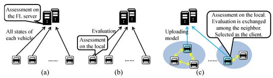 Next, we discuss three client selection schemes as shown in Figure 3: client selection in CFL, client selection in CFL-fuzzy [], and distributed client selection. In CFL, the states of each vehicle are collected by the FL server, which then performs assessment, sorting, selection, broadcasting the global model to all clients, local training, uploading local models, and aggregation as shown in Figure 3a. The FL server in CFL acts as the coordinator. For client selection in CFL-fuzzy, the assessment of each participant is processed locally and then updated to the FL server. Subsequently, the steps of sorting, selection, broadcasting the global model to all clients, local training, uploading local models, and aggregation are carried out as shown in Figure 3b. In distributed client selection, the global model is broadcast to all participants at the start of each round, and the assessment is processed locally. Then, evaluations are exchanged among neighbors, and clients are selected. The selected clients train the model on their local dataset and upload their local models to the FL server. Finally, the FL server aggregates all local models received from the clients as shown in Figure 3c. The detailed process is presented in Section 4.4. The characteristic of distributed client selection is that client selection adopts a distributed scheme, while model aggregation adopts a centralized scheme. Furthermore, the FL server does not know which participants are selected as clients. This scheme minimizes the overhead caused by maintaining the active state of all participants while maintaining the high efficiency of centralized aggregation.