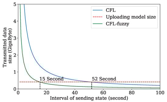 We compare with CFL and CFL-fuzzy [] in terms of the overhead maintaining an active state for all participating devices in the Gboard. The dashed red line represents the size of the uploading model in each round over on the selected 300 client devices. The observation from Figure 4 is that the size of overhead maintaining the active state of all participating devices reaches 22.5 gigabytes in the interval of 1 s. In comparison, the uploading model size is only 0.41 gigabytes. The size of maintaining the active state of all participants decreases with the interval increase. Two curves, CFL and CFL-fuzzy, are crossed with the uploading model size curve at 52 s and 15 s, respectively. However, in a dynamic network, such as IoV, some clients with poor performance are selected and dropped down the model convergence and even cause traffic accidents because the state of the vehicles cannot be updated in such an interval. The distributed client selection framework proposed can achieve low communication overhead and the updating interval of the active state.