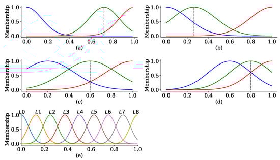The fuzzy evaluator comprises four components: fuzzification, fuzzy rules, defuzzification, and client selection. The Mamdani method is used as the fuzzy inference technique. Regarding the fuzzification of the output value, the output of four variables is mapped into three levels as shown in Figure 5a–d. The normalization of the input variable is associated with the output variable through fuzzy rules and output to nine levels from to . Detailed fuzzy rules are listed in Table 2.