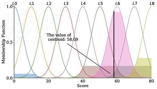 where , , and n denote the sample element, the membership function, and the number of the element in the group, respectively. Figure 6 illustrates the COG. The value of 58.09 in Figure 6 represents an output calculated by (9), and the value belongs to the L6 level.