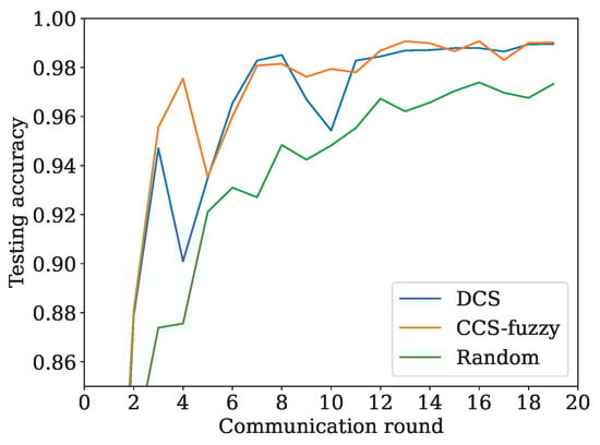 Figure 7 compares the accuracy of DCS, random scheme, and CCS-fuzzy. The sample quantity of the vehicle is the same as in Table 3. Every vehicle owns nine classes, each containing an identical sample quantity. The number of selected clients in the DCS is averaged at 5.15. The number of selected clients in the random scheme and CCS-fuzzy is set to five as a constant. The results can be observed from Figure 7 that the CCS-fuzzy outperforms DCS and the random scheme. The reason is that CCS-fuzzy can select the participating vehicle with the highest evaluation as the client and can accelerate the convergence. In other words, CCS-fuzzy can choose clients with better resources in terms of computational, communication and local datasets. However, it is notable that the proposal also performs well. The two curves of CCS-fuzzy and the proposed scheme are overlapped in the final stage, while DCS largely jitters in the initial step. In conclusion, DCS can achieve the same level as CCS-fuzzy. Furthermore, DCS can outperform the random scheme after a certain communication round.