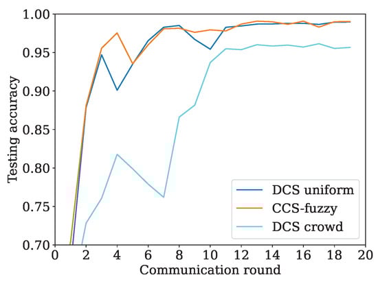 The distribution of participating vehicles can impact the performance of DCS because DCS can select the optimal client in the neighboring small area. To illustrate the case, we design two distributions for participating vehicles, including uniform distribution and extreme distribution, respectively. In uniform distribution, all vehicles are distributed randomly. In the extreme distribution, the vehicles with better evaluation are crowded in one small area, while the remaining vehicles with poor evaluation are crowded in another small area. In Figure 8, the results illustrate the performance involving CCS-fuzzy, DCS with uniform distribution, and DCS with extreme distribution. Other parameters are the same as in Table 3. The number of selected clients in the uniform distribution is averaged at 5.05, while the number of selected clients in the extreme distribution is 6 as a constant. The observation from Figure 8 is that the accuracy of the uniform distribution is approaching the CCS-fuzzy scheme and is better than the performance of the extreme distribution. The reason is described as follows. The vehicles with better evaluation are more likely to be selected as the client in the uniform distribution. On the contract, the vehicles with better evaluation are crowded, leading to “cut-throat competition” in the extreme distribution. Hence, a small number of vehicles with better evaluation are selected as the client and pull down the convergence speed.