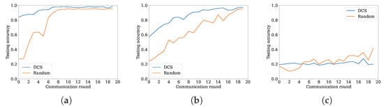 To show the performance regarding the non-independent and identically distributed dataset, we run three experiments with an unbalanced quantity dataset, in which each vehicle contains 9 classes, 6 classes, and 2 classes of 10 classes, respectively. Figure 9 compares DCS and random scheme over the non-independent and identically distributed dataset. In Figure 9, the DCS scheme refers to DCS-uniform, specifically the vehicles distributed uniformly. Under this scenario, the curves of the DCS and CCS-fuzzy schemes overlap each other, as the two schemes select the same nodes as shown in Figure 8. In Figure 9a–c, the number of selected clients in DCS is averaged at 5.15, 5.2 and 4.95, respectively. The number of selected clients for the random scheme is set to 5 as a constant. The conclusion from Figure 9a–c observed is that the non-independent and identically distributed characteristic of the dataset has a great impact on the model accuracy and the convergence speed. The convergence speed accelerates when the characteristics of the dataset are approaching from non-independent and identically distributed to independent and identically distributed because the non-independent and identically distributed dataset increases the weight shifting in training. In the special case, such as without the intersection between the datasets, the accuracy cannot meet the requirements and even cannot converge as shown in Figure 9c. On the other hand, the proposal performs well compared to the random scheme but is extremely non-independent and identically distributed. The reason is that the loss function of local data is considered in the client selection stage. It makes to enhance the diversity of the dataset and decreases the non-independent and identically distributed characteristics.