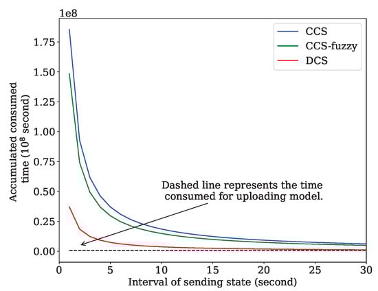 Finally, we analyze the time consumed on the communication overhead. We adopt the accumulated consumed time as a metric, the sum of time each participant consumed on the communication. We adopt Tokyo region as an example to analyze the communication overhead. According to the statistics [], by 2021, the number of registered motor vehicles reached 3.09 million in Tokyo region, Japan. In each communication round, 1000 vehicles are selected as the client. We consider the sum of the total time consumed in communication, including exchanging the model and maintaining the active state of the vehicles. Sending an active state also spends a full latency since it is considered a small packet. Other parameters are listed in Table 3. Figure 10 compares the accumulated consumed time over DCS, CCS-fuzzy, CCS and exchanging the model, except for the random scheme, as it does not need any state information of the vehicle in the selection process. So, in the random scheme, the overhead of the exchange information is zero. The dashed line represents the consumed time for the exchanging of the model. The following results can be seen in Figure 10. First, compared to exchanging the model, the cost caused by maintaining an active state cannot be neglected when the number of participants increases drastically. This conclusion is ignored by most of the prior researchers. Second, accumulated consumed time decreases with the increase in the sending interval, but maintaining an active state also consumes enormous time and energy in CCS and CCS-fuzzy. In addition, the time consumed by DCS is less than that of CCS and CCS-fuzzy. The reasons are as follows. The vehicle-to-vehicle latency using DSRC communication is smaller than the latency from the vehicle to the cloud. Additionally, the multi-objective evaluator running locally not only compresses all the information but protects privacy by avoiding sending all the information involving the vehicle to the neighbors. Finally, broadcasting the evaluation is restricted in each small area, such as a range of 200 m, and reduces the communication overhead.