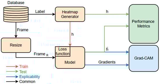 For the development and validation of the tool localization model, three databases were utilized. Frames extracted from these databases were resized before being fed into the proposed model. Additionally, for training purposes, labels in the form of heatmaps were generated and introduced into the model. To evaluate the model, a series of evaluation metrics were employed to compare the predicted heatmap and the ground truth heatmap (h). The schematic representation of this process is depicted in Figure 1. This section details (1) the databases, (2) the developed model (architecture and loss function) and image pre-processing, encompassing rescaling and heatmap generation for labeling, (3) the performance metrics, (4) the Grad-CAM method employed for the visual explanation of the model.