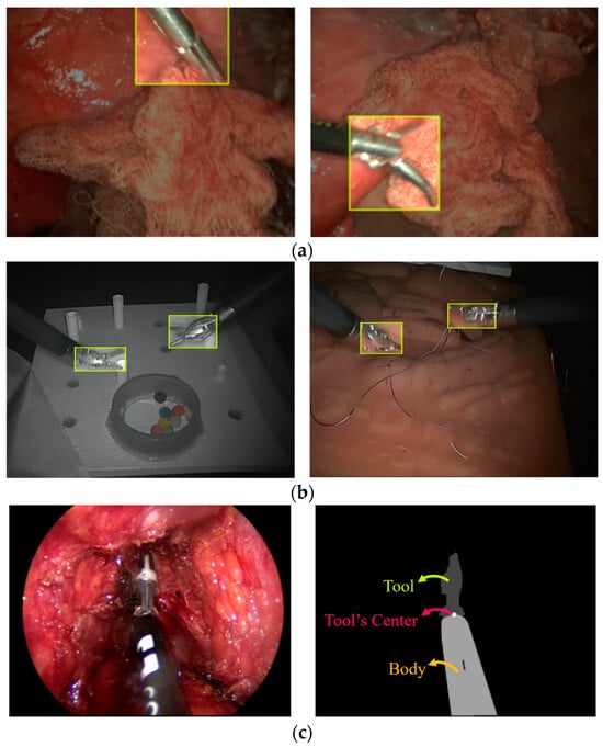 The ATLAS Dione dataset [] comprises 99 study videos wherein ten surgeons execute six different operational tasks employing the da Vinci Surgical System (Figure 2b). Each frame maintains a resolution of 854 × 480 pixels and is accompanied by annotations for surgical tools, including tool type and the positional coordinates of bounding box vertices. While the incorporation of manikin simulators and objects for movement simulations may enhance the generalizability of the model, it introduces a notable limitation by deviating from real-world scenarios.