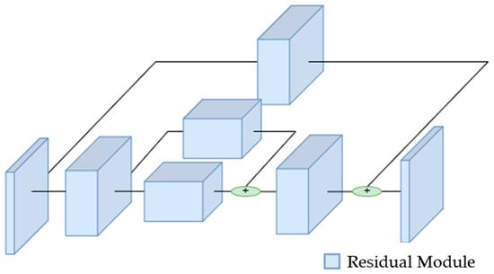 The proposed model is founded upon the Hourglass network, a CNN widely employed for tasks involving the localization of key points in images. This architectural framework was originally introduced by Newell et al. [] to address the challenge of preserving intricate information across diverse spatial scales within a deep neural network using several Hourglass modules (Figure 3). Specifically, the proposed network is based on two individual Hourglass modules arranged in series. Each individual module consists of a down-sampling and an up-sampling stage for feature map dimensionality reduction and expansion, akin to the U-Net model or autoencoder structures. Unlike the U-Net model, this architecture incorporates skip connections with an intermediate processing stage. The main difference of this module from other traditional architectures lies primarily in its greater symmetry between the stages of feature map dimensionality reduction and expansion. Additionally, typical operations in common up-sampling stages in other architectures, such as transposed convolution, are replaced in this module by an up-sampling layer using the k-means algorithm, resulting in lower computational cost as these layers are non-trainable.