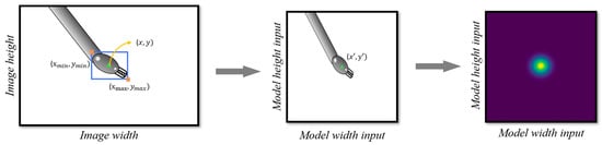 The objective of the network is to produce heatmaps wherein maximum values correspond to tool centers. Hence, it is imperative to generate heatmaps for training purposes, which also implies image resizing (Figure 4). First, the label coordinates, originally in pixels relative to the original image size, are resized to match the network’s output layer size (128 × 128 px). This process involves applying a rescale factor to each axis based on the original image size, ultimately determining the coordinates of the tool’s center within the new image dimensions.