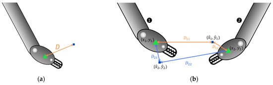 Representation of the Euclidian distance for scenarios with (a) one tool present and (b) two tools present. The green triangle represents the actual location, and the blue square represents the predicted location.
