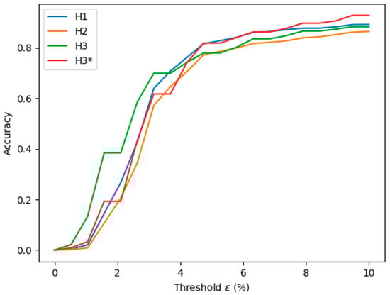 The models’ performance was also evaluated by varying the accuracy threshold ε (Figure 7). Model H3 outperformed all others for error thresholds below 3%, whereas for thresholds exceeding 3%, H3* exhibited superior performance. Model H2 demonstrated the poorest performance across all analyzed error threshold ranges.