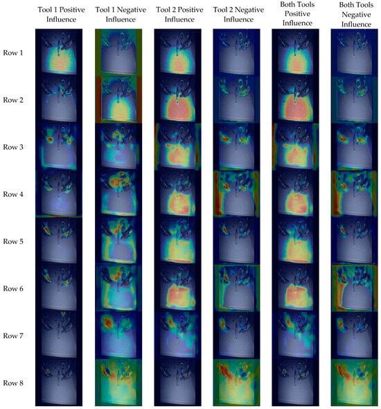 The second Hourglass module (row 8, Figure 9) enables more precise localization of tool centers compared to its predecessor, which primarily focused on discerning tool shapes and other image components. In predicting the tool center, the model considers its spatial placement relative to the background and the other tool. Consequently, the significance of the negative influence heatmaps lies in their provision of information regarding these elements to which the model assigns greater importance.