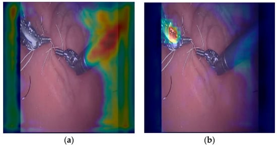 Moreover, the proposed algorithm can concurrently detect up to two rigid-link surgical instruments, as available databases feature such scenarios. While the algorithm is theoretically capable of detecting more than two tools with appropriate image training, rigorous evaluation and testing would be necessary. Similarly, the model is also expected to perform well in detecting other surgical tools based on monolithic compliant structures [,], as suggested by the Grad-CAM analysis (Figure 9 and Figure 10a), which indicates that the model also relies on the tool’s shape to determine the tip’s heatmap. However, the generalizability of the model is limited, posing a significant challenge. This limitation may not be a concern if the model is trained on a dataset more closely resembling the images encountered in the specific application of robotic surgery for which it is intended. This underscores the need for representative training data to ensure optimal models in real-world scenarios.