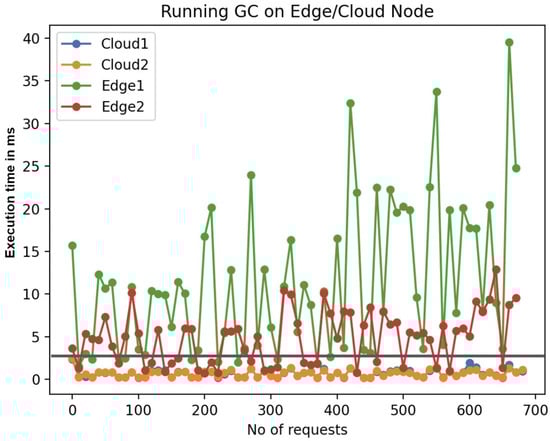 In gif creation (GC) (Figure 5), with a stricter deadline of 3 s, the edge nodes displayed inconsistency with occasional spikes beyond the acceptable window. This variability could be detrimental in high-stakes scenarios where every second counts. The cloud nodes’ performance remained comfortably within the deadline, asserting their capability to handle such operations without breaching QoS parameters.
