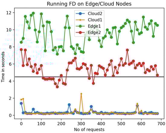 For face detection (FD) (Figure 6), the deadline was set at 5 s. The edge nodes, despite their proximity to data sources, could not consistently meet this benchmark. The cloud nodes, however, consistently processed requests under the deadline, showcasing their reliability for time-sensitive tasks.