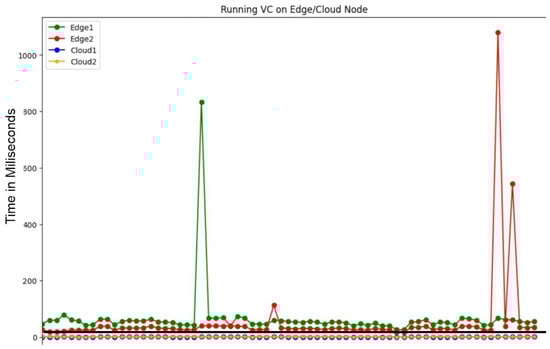 The video conversion (VC) (Figure 7) task posed an even more substantial challenge with a deadline of 8 s, which the edge nodes failed to meet, underscoring their unsuitability for such heavy workloads. The cloud nodes, while generally maintaining performance within the deadline, displayed rare spikes that could indicate the need for additional optimization to ensure unwavering compliance with QoS demands.
