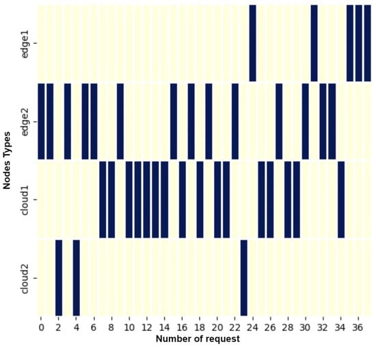 The machine learning model underwent rigorous training, leveraging an extensive dataset comprising 880 images per function. This comprehensive dataset played a pivotal role in informing the decision-making capabilities of the model, resulting in a remarkable 94 percent accuracy, outshining the baseline paper’s 85 percent accuracy []. In Figure 6, the allocation of functions within the heterogeneous infrastructure is demonstrated, revealing a predominant placement within Cloud1. The primary reason behind this is the significantly high execution time for VC (video conversion) on the edges. Placing tasks on either of the edges would likely lead to missed deadlines. Consequently, a majority of placements were made on Cloud1. Tasks requiring additional processing power to meet the deadlines were consequently shifted to Cloud2. Functions were primarily situated in this environment, with a selective migration to Cloud2 necessitated by the inability to meet the QoS requirements within the designated time frame. Only a minimal subset of functions was deployed across both edge environments, a strategic decision made due to latency constraints that could potentially compromise user QoS expectations. Similarly, in Figure 8, function GC placement is also shown among the heterogeneous setup. The request comes with varying workloads and different resolutions. The blue lines indicate the requests executed on a specific node, while the yellow lines indicate those not executed on this node. The system places the functions on the execution nodes. As the system adapts and places the functions according to the deadlines, it intelligently distributes the load among the edges and clouds to meet the deadline and not saturate one node. The X-axis represents the number of requests, and the Y-axis represents the execution nodes types, which are cloud1, cloud2, edge1, and edge2.
