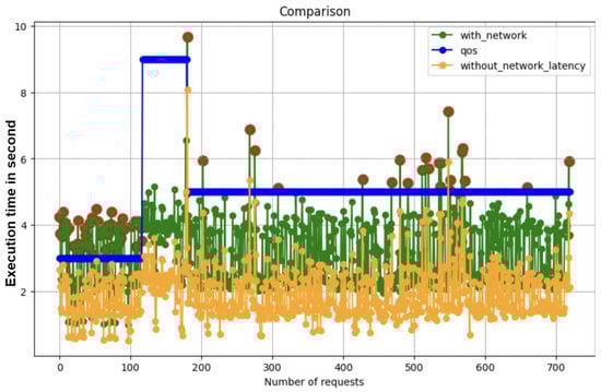 One significant aspect of the model was its network latency predictive functionality. Designed to predict network latency based on geographical coordinates (longitude and latitude) inputted into the model, this feature assumed immense significance. As depicted in Figure 9, meeting deadlines emerged as an absolute priority. Initial observations without considering network latency consistently met deadlines. This provides an essential insight into the role of network latency in function placement within serverless architectures. This illustrates the significant difference in deadline compliance when network latency is considered versus when it is not.