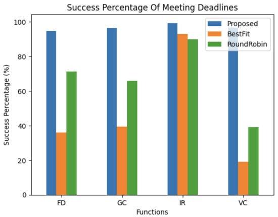 Best Fit: The method functions based on the fundamental premise of maximizing function distribution among computer nodes while minimizing resource consumption []. Within the framework of the setup, the Best Fit algorithm attempts to assign functions mostly to edge nodes prior to using cloud resources. From a logical standpoint, as well as from the graphic depiction Figure 10, it is clear that the Best Fit algorithm has more missed deadlines than the proposed approach. This discrepancy results from the Best Fit algorithm’s failure to take deadlines into account when determining where to position functions.
