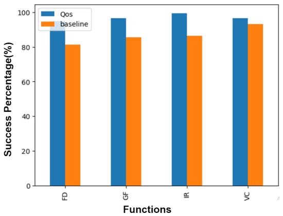 An essential metric for evaluating the effectiveness of our proposed machine learning model for function placement is its ability to meet operational deadlines, especially when compared to existing approaches. Figure 11 illustrates the performance of our system in comparison to a baseline system described in prior research. The blue bars represent the number of deadlines met by our proposed system for four distinct functions, while the orange bars depict the performance of the baseline system.