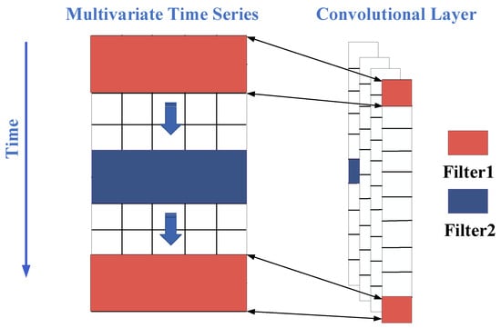 A Convolutional Neural Network (CNN) is a class of feedforward neural networks with a deep structure. In this study, 1DCNN was used to process the time series data of pressure pulsation [24]. The analysis process of 1DCNN is illustrated in Figure 1, which shows a multidimensional matrix of the input time series data. The red and blue colors represent different filters [25]. After the filters perform convolutional operations with the input data, the extracted feature dimension becomes N × 1, where N depends on the input data dimension, filter size, and convolution stride. Assuming M filters are used, the final extracted feature dimension becomes N × M [26].
