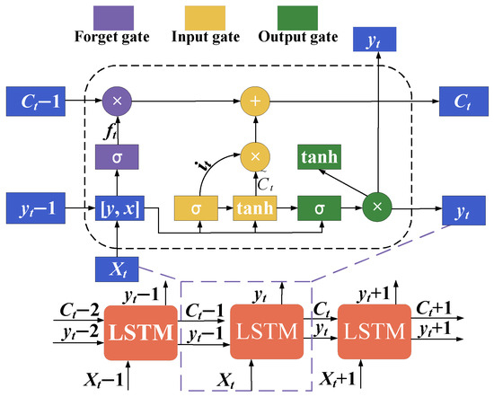 Long Short-Term Memory (LSTM) is a special type of Recurrent Neural Network (RNN), and its basic structure is illustrated in Figure 3. At each time step, LSTM takes inputs, the hidden state, and the memory cell from the previous time step as input. The prediction process of LSTM can be summarized as follows [28]: