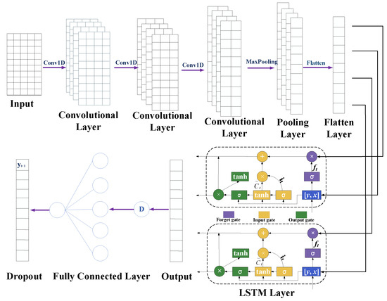 Step 4: The data processed by the 1DCNN is then utilized as input for the LSTM. The parameters of the forget gate, input gate, and output gate of the LSTM network are continuously adjusted through iterative training on a large amount of data. This enables the LSTM to learn the temporal relationships between the data from the information extracted by the 1DCNN network, thereby effectively dynamically modeling the input–output data of the time series for prediction and data analysis.