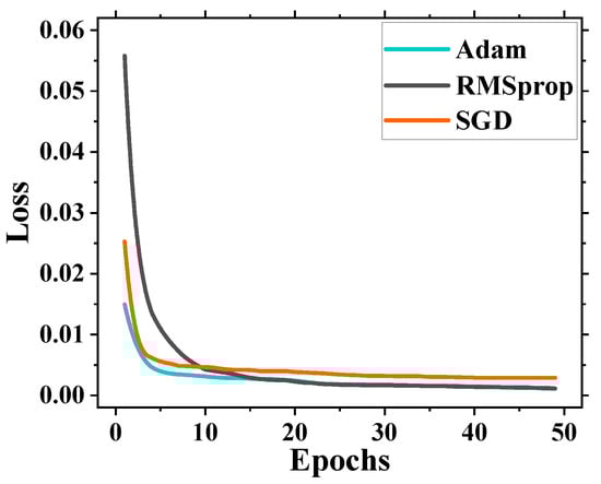In order to select the most suitable gradient descent optimization algorithm for the 1DCNN-LSTM based on its structural characteristics, a comparative experiment was conducted using common optimization algorithms such as Adaptive Moment Estimation (Adam), Root Mean Square Propagation (RMSprop), and Stochastic Gradient Descent (SGD) [30]. The changes in their loss functions were analyzed to determine the optimal choice. The training loss curve, as shown in Figure 5, represents the Root Mean Square Error (RMSE) on the vertical axis and the number of epochs or iterations during training on the horizontal axis. From Figure 5, it can be observed that the Adam optimization algorithm reaches a stable loss function value around the 10th training iteration, while the stability of the RMSprop and SGD optimization algorithms lags behind. This indicates that the Adam optimization algorithm exhibits faster convergence speed when dealing with this time series data. Furthermore, by comparing the loss function values of the three optimization algorithms, it can be observed that the RMSE is the smallest for the Adam method. Based on the aforementioned analysis, the Adam optimization algorithm was selected because it demonstrated the best performance in training the model.