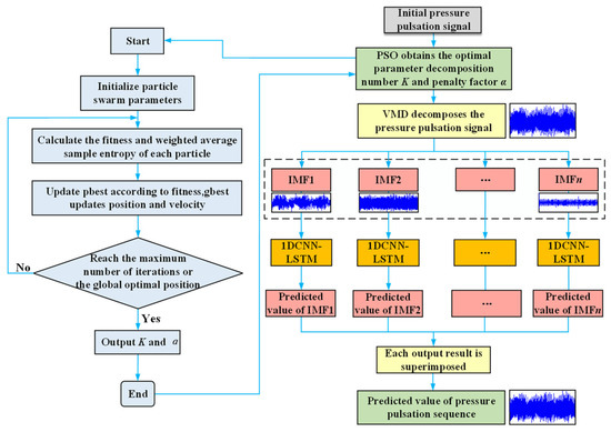 Workflow of the VMD-PSO-1DCNN-LSTM centrifugal pump pressure pulsation prediction model.