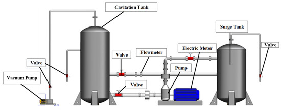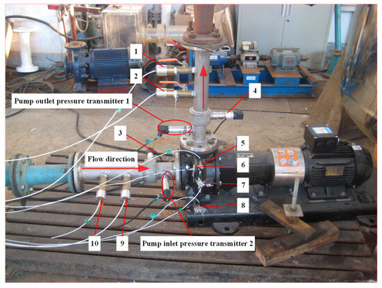 A single-stage, single-suction centrifugal pump was selected in this study, which had the following main technical parameters: design head Hd = 20.2 m, design flow rate Qd = 50.6 m3/h, design speed n = 2910 r/min, number of impeller blades Z = 6, and specific speed at the design operating point ns = 132.2. The experimental part of the study was conducted on a closed-loop test rig, as depicted in Figure 7. Due to the significant differences in the pressure fluctuations at the inlet and outlet of the centrifugal pump, two pressure sensors with different ranges were used in this experiment. The position of the sensor is shown as “Pump inlet pressure transmitter 2” in Figure 8.