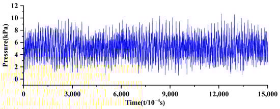 For the acquisition of pressure pulsation values, a high-frequency dynamic pressure sensor and a static pressure sensor, model HM90-H2-2-VCR-F-W2, were selected. The main performance parameters are shown in Table 2 and Table 3. The data from the sensor located at the inlet was selected for this study. The inlet pressure condition was set to 8 kPa, and the sensor sampling frequency was 10,000 per second. The current signals output by the pressure sensors were collected using a USB 6343 data acquisition card produced by NI Company (Austin, TX, USA). The original pressure fluctuation data used are illustrated in Figure 9.