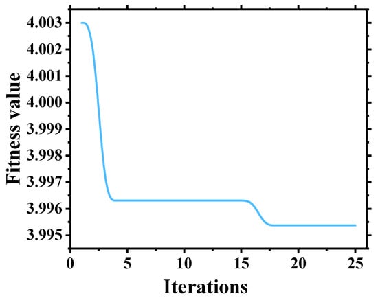 In the PSO algorithm, the values of and were set to 1.5, and was set to 0.8. The initial velocities of particles were randomly generated within the range of [0, 1]. The population size was set to 10. After conducting the PSO optimization calculations, the optimal number of VMD decompositions was determined to be 6, the optimal penalty factor was found to be 532, and the optimal comprehensive index was measured as 3.9954. The convergence process is illustrated in Figure 8. The noise tolerance was set to 0, and the convergence criterion tolerance was set to 1 × 10−7. The convergence curve of VMD-PSO parameter optimization is shown in Figure 10.