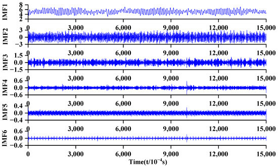 Based on the theories mentioned in Section 2.1 and Section 2.2, the data points of the inlet pressure pulsation time-domain data of the centrifugal pump were subjected to PSO-VMD decomposition. The decomposition results of the original pressure fluctuation signal are shown in Figure 11.