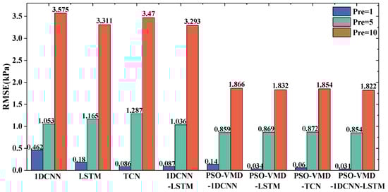 It can be observed that the neural network prediction results using the data preprocessed by PSO-VMD exhibit improvements in both RMSE and MAPE compared with the group without preprocessing, as shown in Figure 12 and Figure 13. The enhancement is particularly significant in terms of RMSE, indicating the effectiveness and adaptability of PSO-VMD in decomposing pressure pulsation signals and accurately extracting their modal components. PSO-VMD employs Variational Mode Decomposition to extract local modes of the pressure pulsation signal and optimizes the parameters through Particle Swarm Optimization. This approach enables the neural networks to learn higher-level feature representations. By using these modal components as inputs, the neural networks can better capture the global characteristics of the pressure pulsation signal. It is demonstrated that the combination of PSO-VMD and the four neural network models outperforms individual prediction models in terms of performance.