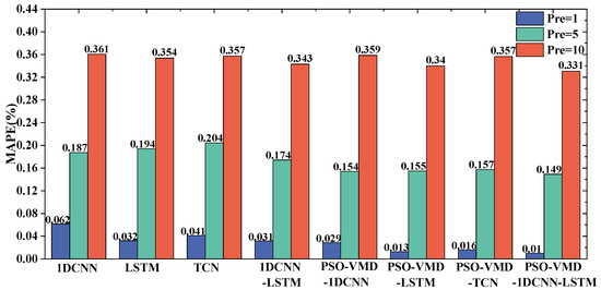 Based on the results of Section 4.4, it has been demonstrated that the combination of PSO-VMD and the four neural network models outperforms individual prediction models. To further validate the effectiveness of the proposed models in the prediction of centrifugal pump pressure pulsation, four models, namely PSO-VMD-1DCNN, PSO-VMD-LSTM, PSO-VMD-TCN, and PSO-VMD-1DCNN-LSTM, were designed and compared using multiple forward prediction steps. The forward prediction step size is defined as the time interval between the prediction target and the current time point used to make that prediction. Typically, after n prediction steps, the interval between the future value being predicted and the last data point used for the prediction is n time units. This means that at every point n steps ahead, the predicted value should closely match or conform to the actual observed value.