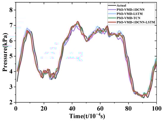 The 1DCNN-LSTM model demonstrates superior prediction results compared with the individual 1DCNN, LSTM, and TCN models. This is primarily due to the presence of complex nonlinear relationships in centrifugal pump pressure pulsation signals, which cannot be fully captured by linear models. The 1DCNN-LSTM model enhances its ability to model these nonlinear relationships by utilizing nonlinear activation functions and gating mechanisms. The convolutional operation in the 1DCNN layer and the gating mechanism in the LSTM layer effectively handle the nonlinear features in centrifugal pump pressure pulsation signals, resulting in improved prediction accuracy. In contrast, the linear operations in the 1DCNN, LSTM, or TCN models are less effective in capturing the nonlinear characteristics of centrifugal pump pressure pulsation signals. Another contributing factor to the improved performance of the 1DCNN-LSTM model is the presence of components with different frequencies and amplitudes in centrifugal pump pressure pulsation signals. The 1DCNN layer in the 1DCNN-LSTM model allows for multi-level feature extraction, enabling the capture of features at different time scales in centrifugal pump pressure pulsation signals.