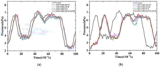 In the results with a forward prediction step of 5, reductions in RMSE of 0.00464 kPa, 0.01446 kPa, and 0.001787 kPa are observed for 1DCNN-LSTM compared with the 1DCNN, LSTM, and TCN models, respectively, as analyzed from Figure 12 and Figure 13. Additionally, 1DCNN-LSTM achieves reductions in MAPE of 0.502%, 0.591%, and 0.839% compared with the 1DCNN, LSTM, and TCN models, respectively. For the results with a forward prediction step of 10, 1DCNN-LSTM demonstrates reductions in RMSE of 0.043747 kPa, 0.009897 kPa, and 0.031267 kPa compared with the 1DCNN, LSTM, and TCN models, respectively. Moreover, 1DCNN-LSTM achieves reductions in MAPE of 2.775%, 0.922%, and 2.582% compared with the 1DCNN, LSTM, and TCN models, respectively. Through the analysis of Figure 15a, it can be observed that all four models exhibit similar trends to the actual values, but a local lag phenomenon is present. However, both 1DCNN-LSTM and TCN models show some differences compared with the 1DCNN and LSTM models in capturing local extrema, but they still effectively reflect the overall trend of the data. Through the analysis of Figure 15b, it can be deduced that all models exhibit significant differences from the true values, with all four models showing lagging and deviating phenomena. Specifically, the 1DCNN and 1DCNN-LSTM models capture individual peaks in local areas. Based on the performance of the models in forward prediction step sizes of 5 and 10, it can be concluded that 1DCNN-LSTM achieves higher prediction accuracy across multiple step sizes.