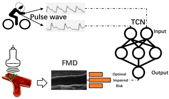 Overall experimental design. The overall architecture of the model: the input is the PPG data in exercise, the outputs are the three classifications of FMD—OPTIMAL, IMPAIRED, and RISK—and the TCN is used for training the model. Abbreviations: TCN: Temporal Convolutional Neural Network; FMD: flow-mediated dilation.