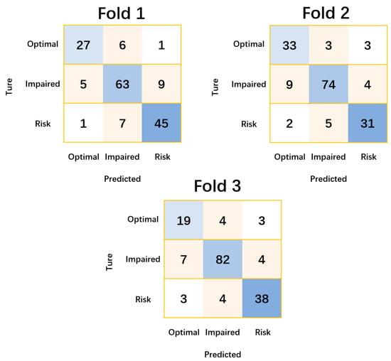 Confusion matrices for the prediction of flow-mediated dilation levels by temporal convolutional neural networks in each fold. Optimal, Impaired, and Risk are the three levels of blood flow-mediated dilatation, respectively, and the criteria for classification are referenced from epidemiological investigations [25]. The numeric values represent the number of specific categories, the higher the value, the darker the colour.